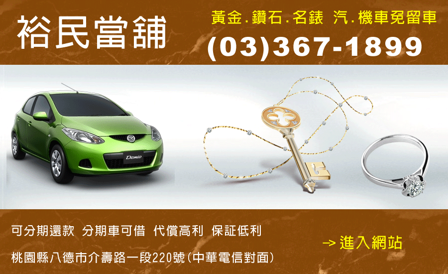 裕民桃園當舖,不限車齡分期車可貸,桃園汽車借款利率低,各車種車齡轉當優惠,快速拿款免押車,另有桃園房屋二胎服務,公定月息,隨時借當日放款!黃金、鑽石、名錶、翡翠、3C、精品專業店家桃園當舖免費估價鑑定,政府立案鶯歌當舖、汽車借款,手續簡便,放款迅速,首次借款免利息,不論是勞工貸款,軍公教貸款,薪轉借款,歡迎來電洽詢。